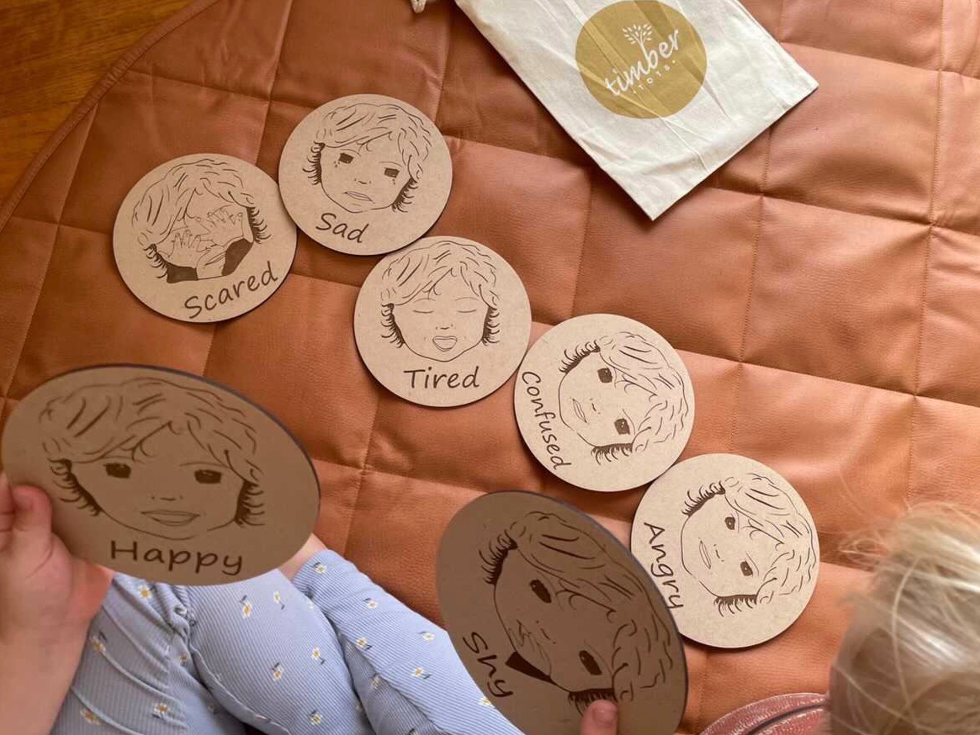 הסט כולל 7 דיסקיות עץ חרוטות להפליא המתארות רגשות
